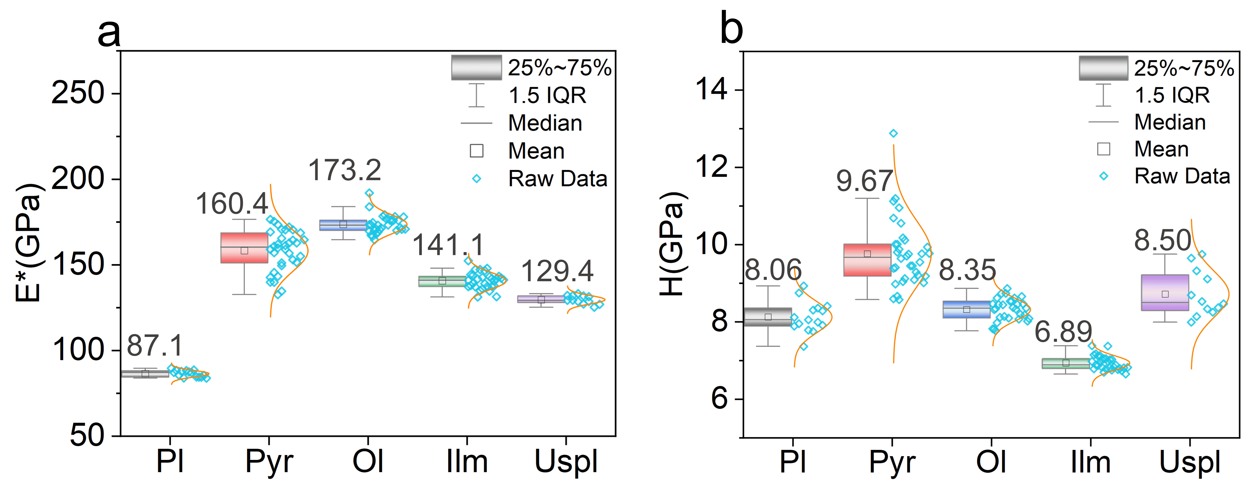 图2 嫦娥五号月壤矿物的微观力学性质。(a)弹性模量分布;(b)压入硬度分布。注:图中的标注数字代表中位值。Pl:斜长石;Pyr:辉石;Ol:橄榄石;Ilm:钛铁矿;Uspl:尖晶石