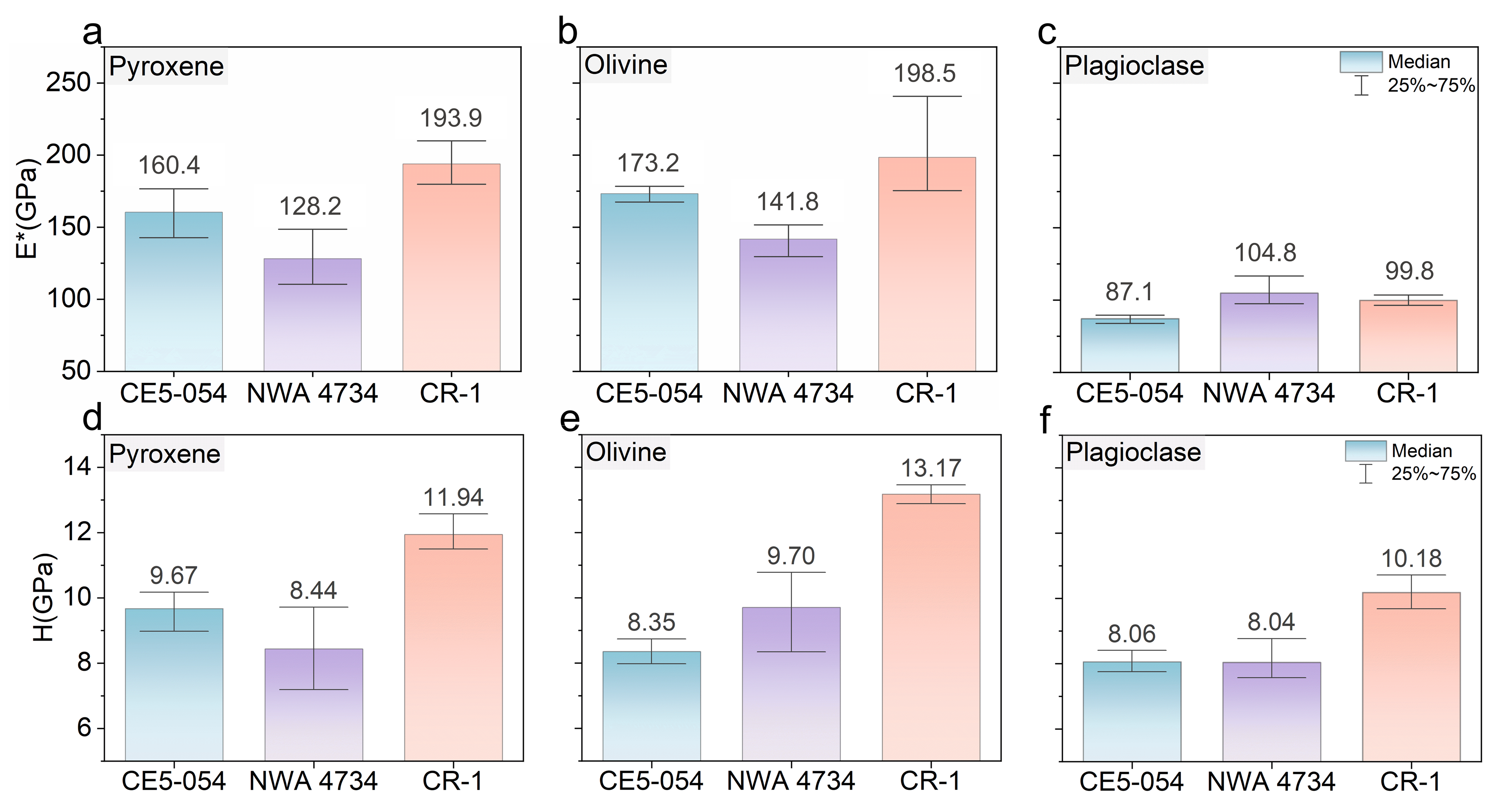 图3 CE5-054、NWA 4734和CR-1的微观力学参数对比。(a-c)辉石、橄榄石和斜长石的弹性模量;(d-f)辉石、橄榄石和斜长石的压入硬度。注:图中的标注数字表示中位值