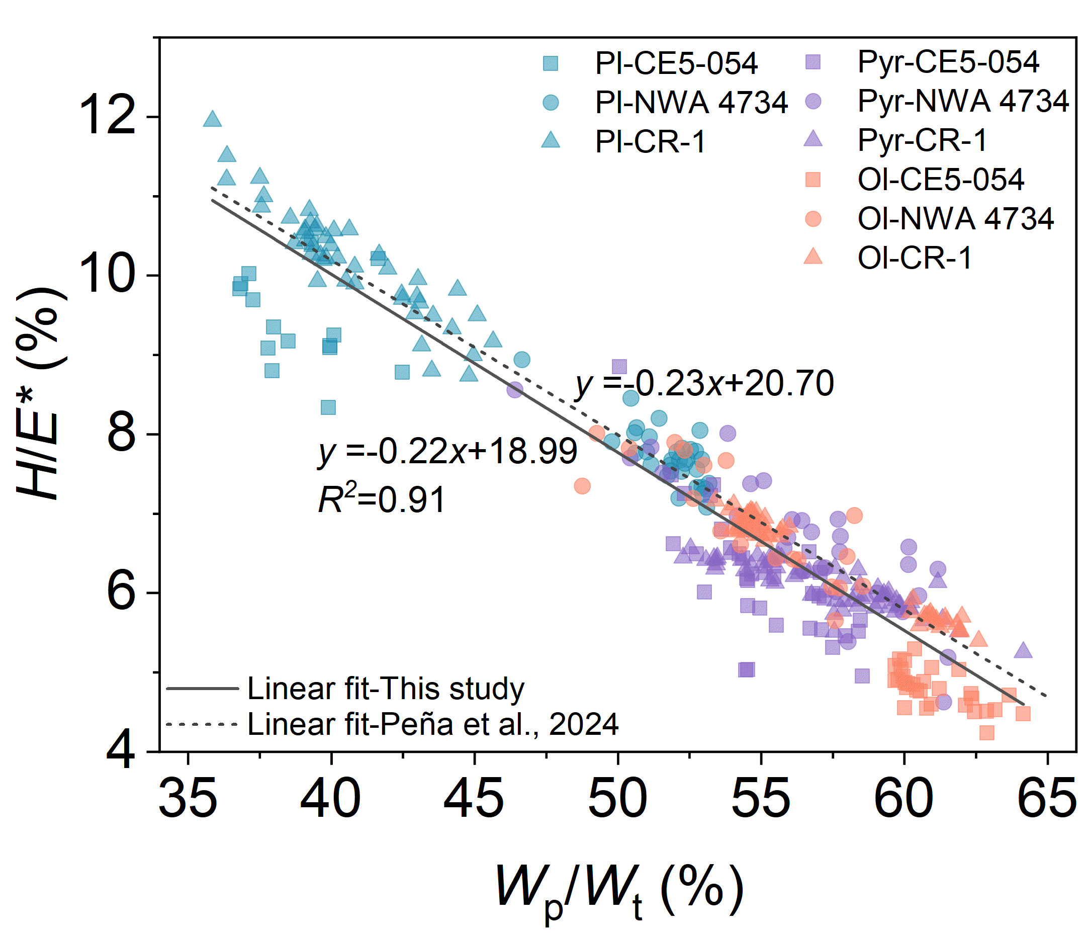 进一步分析发现,无论矿物来自地球、月球还是陨石,它们的H/E*和Wp/Wt(塑性功/总功)均集中分布在一条直线附近,这一趋势与已有基于多个月球陨石样品建立的拟合关系高度一致(图4)。这意味着,不同来源的矿物在微观变形过程中的响应机制可能遵循某种共性的内在规律,相关机理仍有待进一步深入研究。