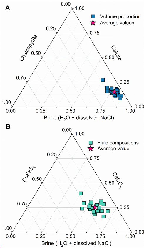 此外,本研究还对包裹体中黄铜矿的成因机制进行了系统分析。结合松多地区的热力学模拟结果可知,在弧下深度条件下,硫主要以氧化态形式(如硫酸根)存在于流体中(图3B)。进一步通过评估流体包裹体与寄主矿物之间的反应关系,发现包裹体周围绿辉石中Fe含量最大变化约为0.4wt.%,表明在包裹体形成及其后期演化过程中,流体与寄主矿物之间发生了有限但可识别的元素交换。这一现象指示:原本以氧化态存在的硫在包裹体封存后,可能通过与寄主矿物之间的还原反应转化为还原态硫物种。在此基础上,还原态硫与包裹体中共存的Cu和Fe发生反应并沉淀形成黄铜矿,从而解释了多相流体包裹体中硫化物矿物的形成机制。该过程揭示了从“氧化态硫迁移”到“局部还原沉淀”的转化路径。这一认识进一步表明,弧下深度富集硫的氧化性流体不仅能够高效迁移硫,同时也具备显著的铜迁移能力,为弧岩浆源区的硫富集及斑岩型铜矿的形成提供了关键的物质来源约束。
