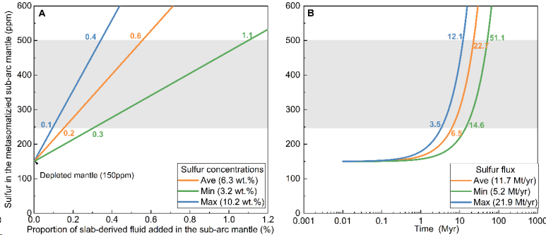 考虑到松多榴辉岩形成于典型的冷俯冲带环境,而全球俯冲体系以冷俯冲带为主,因此,本研究获得的流体硫含量对评估全球俯冲带硫通量具有重要代表性。在开展硫通量估算之前,首先需要对水通量进行约束,因为水是驱动挥发分迁移的主要载体。基于热力学模拟结果,松多榴辉岩记录了约~60%的板片脱水比例(图3A)。在此基础上,结合全球俯冲带蚀变洋壳的厚度及俯冲带长度等关键参数,估算得到弧下深度(~90km)处的水通量约为~91 Mt/yr。进一步结合本研究基于流体包裹体定量获得的流体组成(包括H2O与S含量),可将水通量转换为硫通量,估算全球蚀变洋壳在弧下深度释放的硫通量约为~11.7Mt/yr。该结果表明,俯冲板片在弧下深度通过富硫流体可释放约三分之一的硫进入地幔楔。进一步的质量平衡计算显示,在持续约6.5–22.7Myr的流体交代作用下,上覆地幔楔的硫含量可由初始约150ppm显著提升至约250–500ppm(图4)。该富集幅度足以解释弧岩浆源区中普遍观测到的高硫特征,并表明板片来源流体可贡献约60–80%的弧岩浆硫来源。总体而言,这一基于直接定量结果的通量估算,不仅为俯冲带硫迁移效率提供了关键约束,也在全球尺度上解决了俯冲板片输入与弧岩浆输出之间长期存在的不平衡的争议。