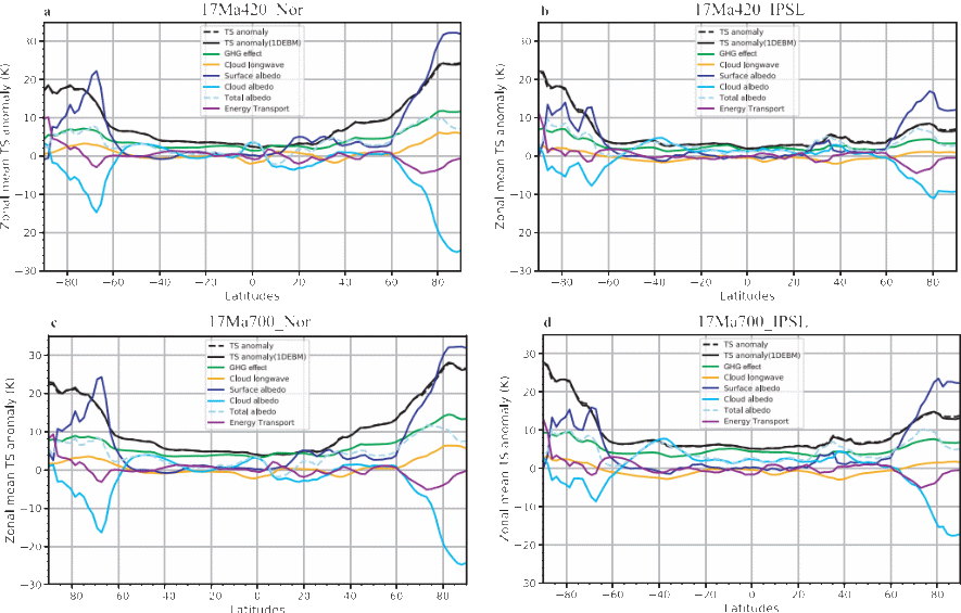 图1 两个模式MCO模拟结果的一维能量平衡分析。左列为NorESM1-F模式结果,右列为IPSL-CM5A2模式结果;上行对应2.5倍工业革命前CO2情景,下行对应1.5倍情景。彩色曲线分别表示温室效应(绿色)、云长波反馈(橙色)、地表反照率(深蓝)、云反照率(青色实线)、总反照率(青色虚线)和经向能量输送(紫色)的贡献。两个模式在主导机制上表现一致,但NorESM1-F模拟的北半球高纬度增温幅度明显大于IPSL-CM5A2