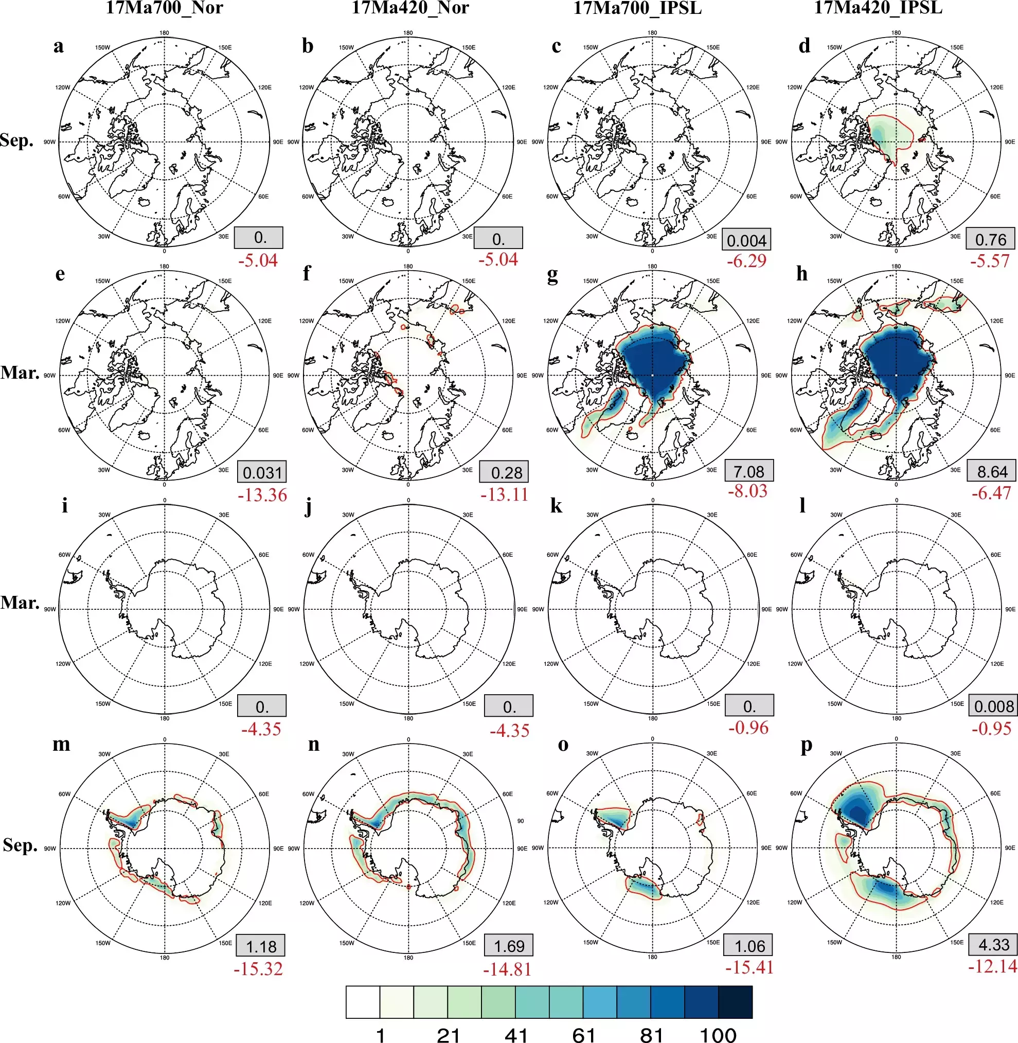 图2 两个模式MCO模拟的南北半球季节性海冰分布。上两行为北半球3月和9月海冰分布,下两行为南半球结果。红色等值线表示海冰分布大于15%的区域,灰框内数值为海冰总面积(单位:百万平方公里),红色数值为相对于工业革命前的异常。两个模式在北半球海冰模拟上存在明显差异