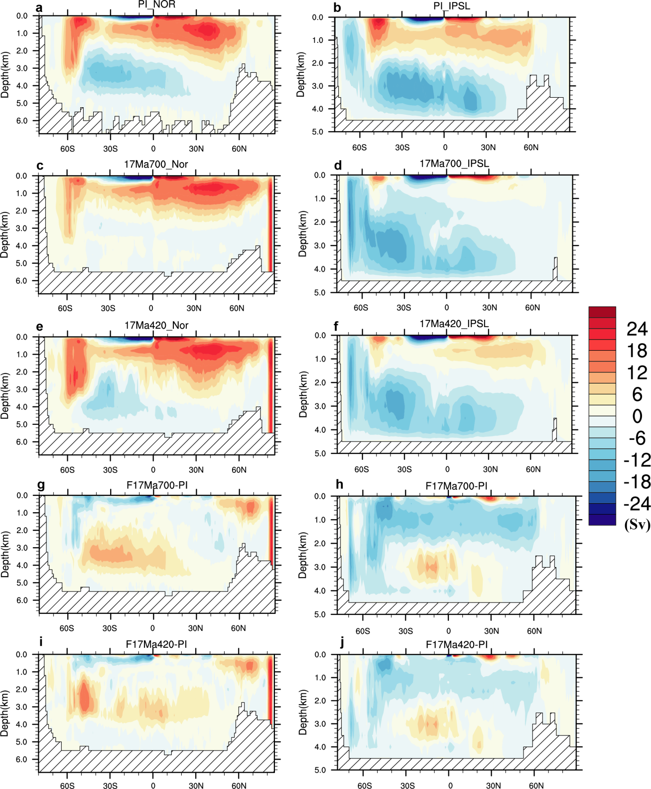 图3 两个模式模拟的全球经向翻转环流(GMOC)。上两行为工业革命前对照实验和2.5倍CO₂ MCO实验结果,中间两行为1.5倍CO₂ MCO实验结果,下两行为MCO相对于工业革命前的异常(单位:Sv)。左列为NorESM1-F结果,右列为IPSL-CM5A2结果。两个模式模拟的翻转环流响应存在明显差异