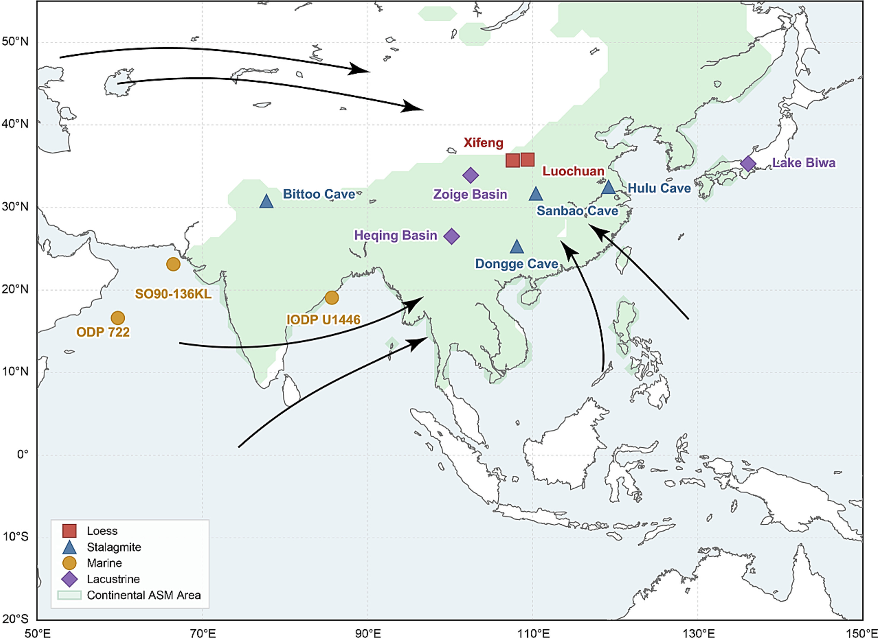 图1 亚洲陆地季风区与代表性地质记录分布图
