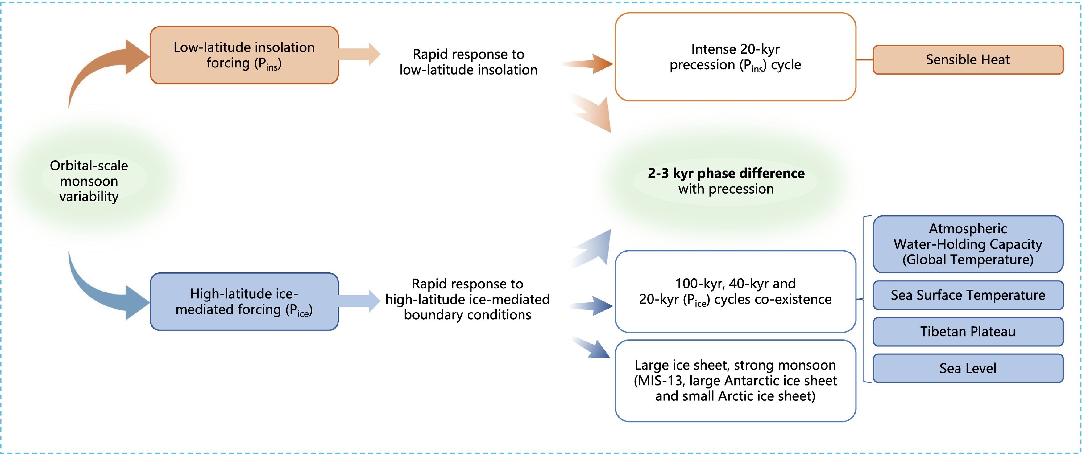 1.双强迫路径:轨道时间尺度上季风强度变化主要由两条强迫路径构成——低纬夏季日照量变化直接驱动的“日照量路径”(Pins)和冰期-间冰期旋回调节的“冰量影响路径”(Pice)。季风演化包含约10万年、约4万年和约2万年周期,其中前两者主要受冰盖控制,后者是低纬夏季日照量与高纬冰盖约2万年信号复合的结果。