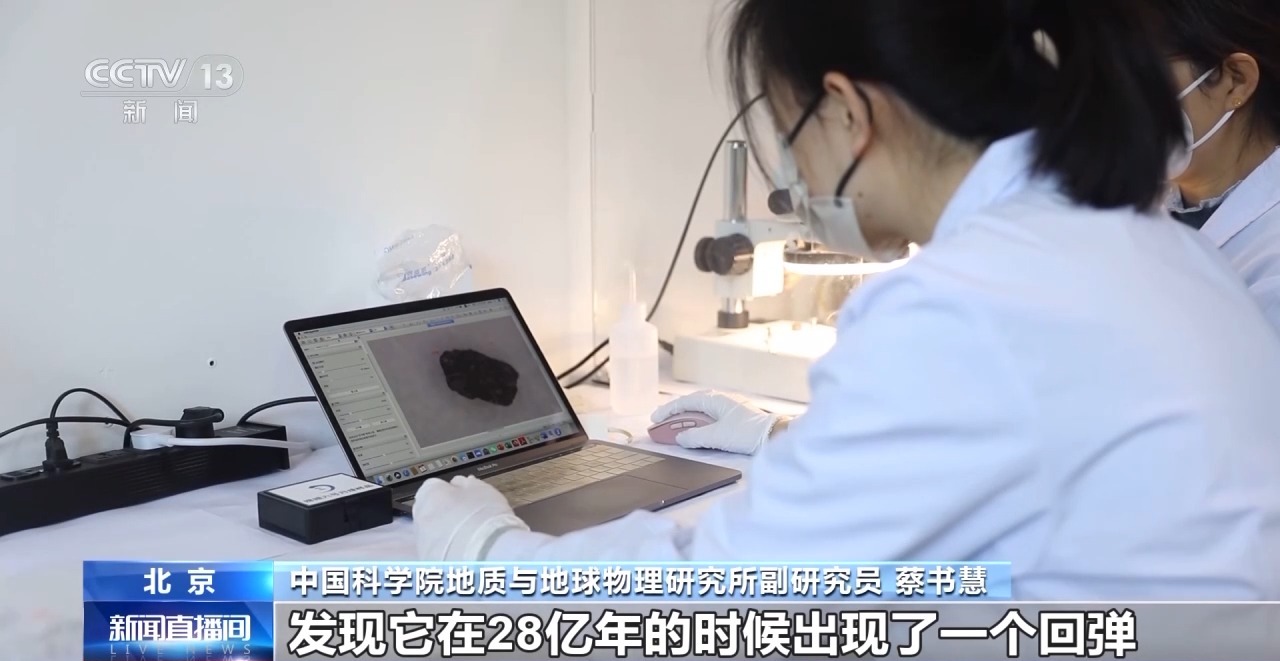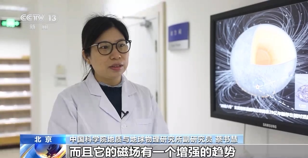 中国科学院地质与地球物理研究所副研究员 蔡书慧:距今30亿到20亿年之间以前是没有数据的,完全是空白,不知道这一段磁场是怎么变的,以前的研究认为,月球磁场在距今31亿年左右有一次剧烈下降,下降之后可能一直处于一种非常低能量的状态,我们这个发现跟之前的认识不太一样,发现它在28亿年的时候出现了一个回弹,这说明它可能下降了之后还有波动、有回升。
