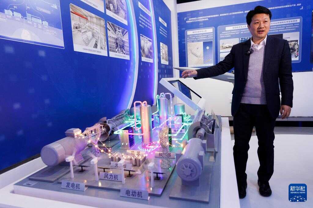 1月15日,中国科学院工程热物理研究所所长陈海生研究员在所展馆介绍“大规模压缩空气储能新技术与应用”成果。“大规模压缩空气储能新技术与应用”成果获得技术发明奖。(新华社记者 金立旺 摄)