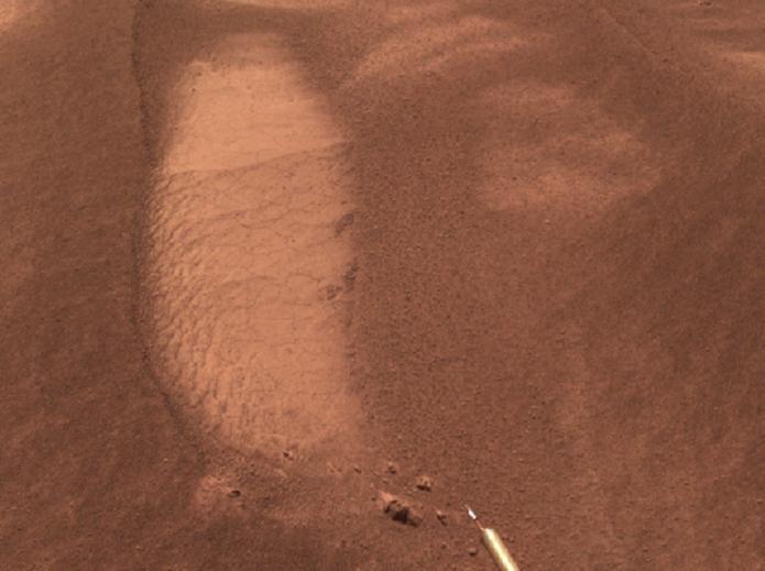 秦小光仍记得,刚拿到第一批祝融号火星车数据时的兴奋感。祝融号着陆区地貌最显著的是沙丘,他与中国科学院国家天文台研究员任鑫查看火星车车载相机传回的照片时惊奇地看到沙丘表面的奇特现象——龟裂和带状痕迹。