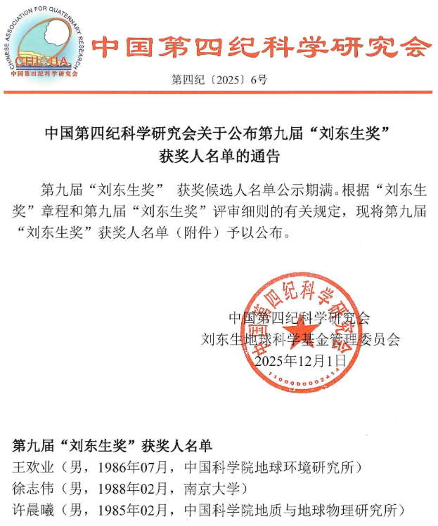 2025年12月1日,经中国第四纪科学研究会16名会员自由申报、刘东生地球科学基金管理委员会7位委员无记名排序评审和全体委员(不含上述7位委员)无记名投票评审,我室许晨曦研究员荣获第九届“刘东生奖”。