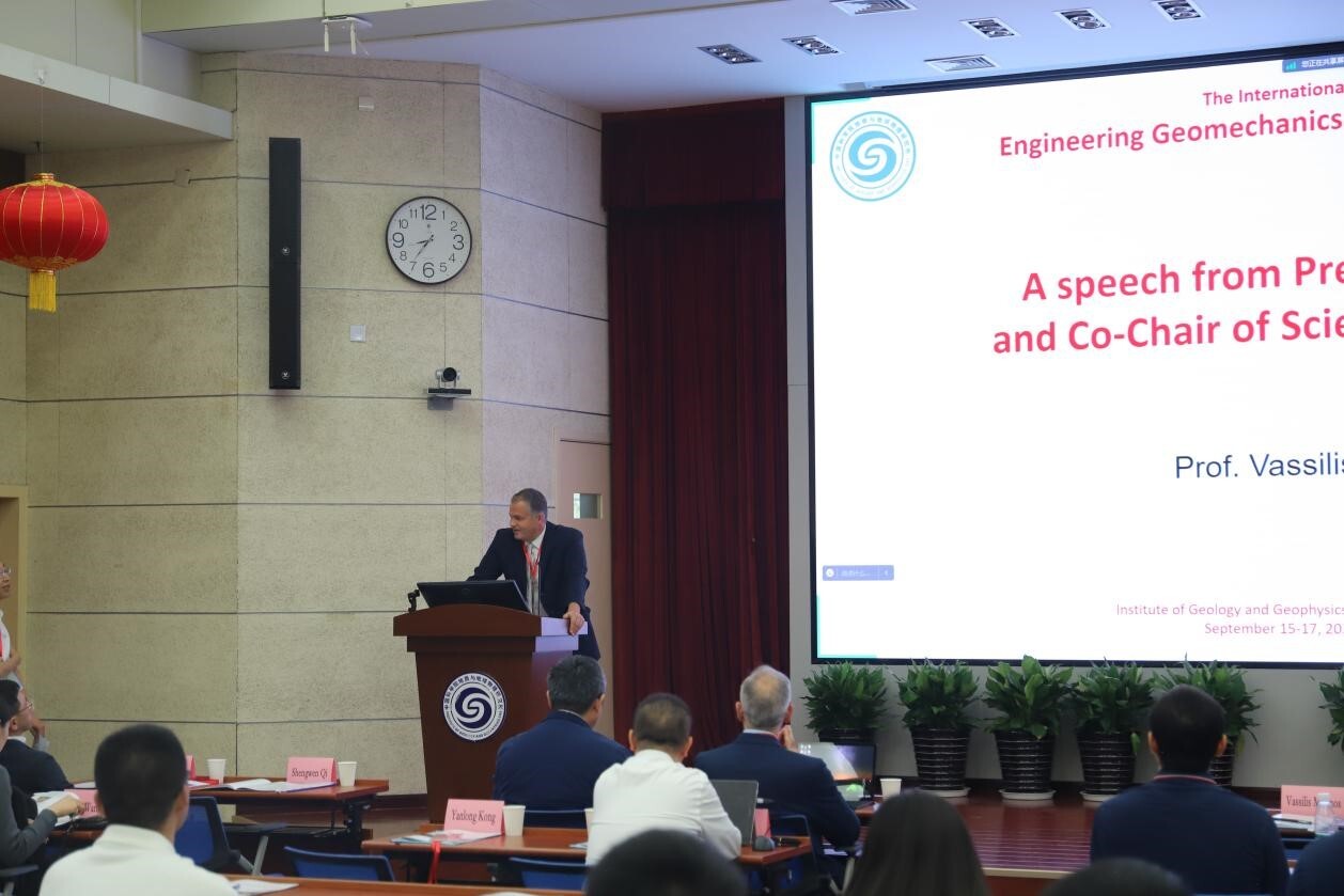 开幕式由祁生文主持,岩石圈演化国家重点实验室主任万博研究员与Vassilis Marinos、伍法权致开幕辞。万博点明“向地球深部进军”为本次会议讨论的重点;“为青年学者提供与杰出学者交流的平台”为本次会议重要目的,并鼓励青年学者勇于展现自己,积极服务国家战略需求;Vassilis Marinos作IAEG简介,并高度赞扬了我所谷德振院士、王思敬院士在上世纪带领中国工程地质加入IAEG,成功走向世界学术舞台的努力,号召大家学习两位先辈的勇气和担当,引领潮流,探索真理,深入国际交流,共同进步;伍法权简述了IAEG中国委员会发展史,强调了本次国际会议在中国召开的重大意义并预祝会议圆满成功。