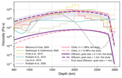 图1.基于本研究Si空位浓度 (R3 + R4) 沿地温梯度计算得到的粘度剖面。