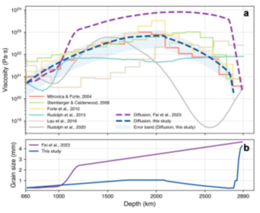 图2. a) 基于本研究Si空位浓度(R3 + R4)与Fei et al. (2023) 晶粒尺寸模型(紫色虚线)计算的下地幔粘度剖面;蓝色虚线为扩散蠕变产生的粘度,对应晶粒尺寸从660 km处约0.3 mm增至约2000 km处1 mm,再降至约2800 km处约0.3 mm。b) Fei et al. (2023) 晶粒尺寸模型与本研究使用模型对比。