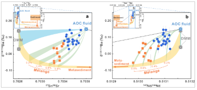 研究发现,伊豆弧岩浆的Ba-Sr-Nd同位素及微量元素组成特征不能用流行的流体交代地幔楔熔融或混杂岩模型来解释,而与“混杂岩底辟-板片流体交代熔融”两阶段过程很好吻合(图1)。据此,研究团队提出了弧岩浆的两阶段形成过程:(1)在较浅俯冲深度,沉积物与地幔橄榄岩在板片界面混合形成混杂岩,并以底辟形式上升进入地幔楔;(2)当板片俯冲至弧下深度时,蚀变洋壳(AOC)脱水释放流体向上交代混杂岩源区,并导致其熔融形成弧岩浆(图2)。